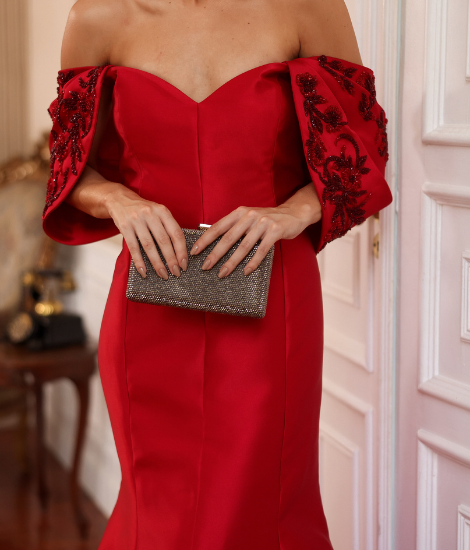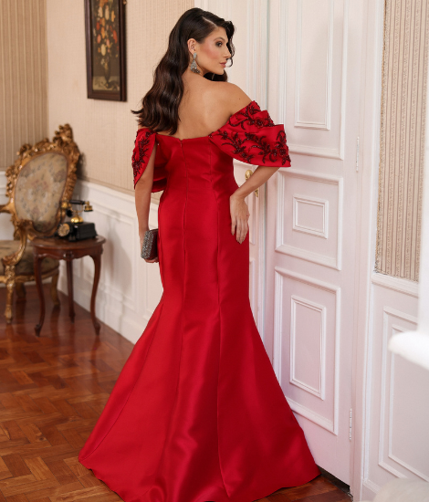 Vestido Annelize, na elegante cor vermelha, destaca-se pelo corte sereia sofisticado e pelo design ombro a ombro. As mangas removíveis, cuidadosamente bordadas, adicionam um toque de requinte e versatilidade, tornando-o ideal para ocasiões que exigem sofisticação e estilo.