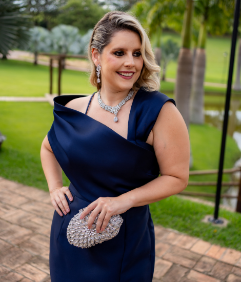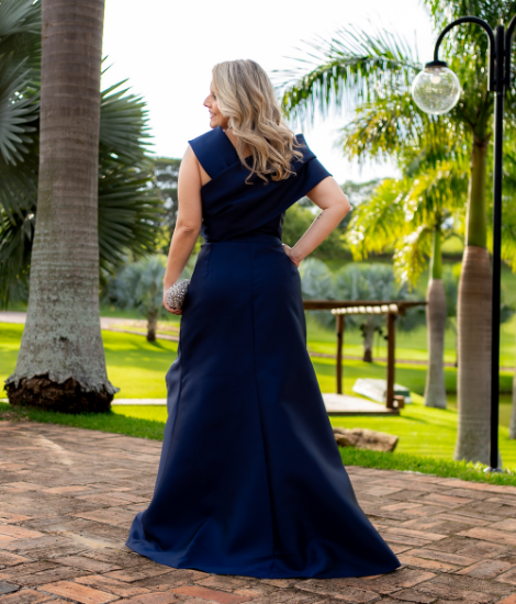 Vestido longo confeccionado em zibeline azul, com modelagem elegante e moderna. Possui fenda frontal, caimento estruturado e alça lateral versátil, que destaca o busto com sofisticação.