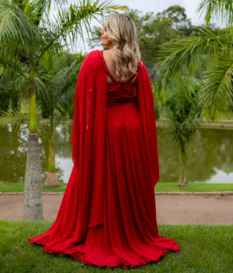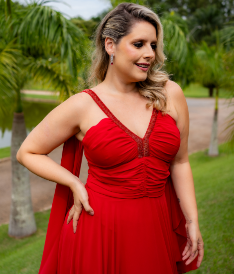 Vestido longo de musseline vermelho com manga morcego e bordado no busto e na cintura.