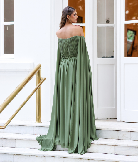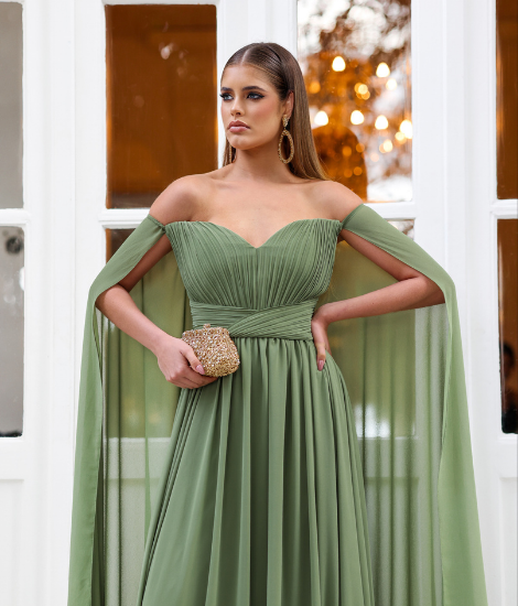 Vestido longo em verde oliva, com mangas removíveis no estilo ombro a ombro. Um design fluido e elegante que combina charme e versatilidade, ideal para eventos sofisticados.