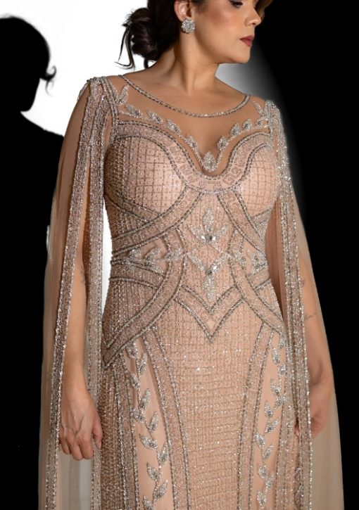 Vestido rose inteiro bordado, com detalhes em prata. Possui manga-capa com transparência e bordados e detalhes com transparência na parte superior.
