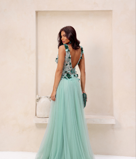 Vestido verde menta com decote em V, flores em 3D no busto e fenda lateral, perfeito para um visual delicado e sofisticado.