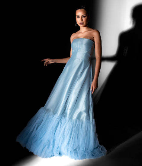 Vestido longo tomara que caia em zibeline e tule, na cor azul serenity. Modelagem evasê com babado na barra, trazendo leveza e sofisticação para eventos especiais.