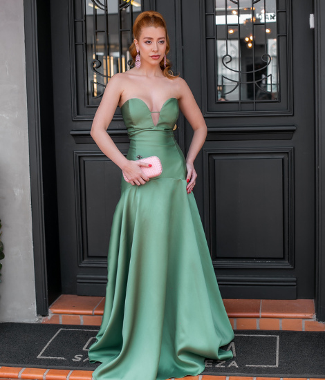 Vestido verde oliva em zibeline, com modelagem sofisticada em alfaiataria e decote tomara que caia.