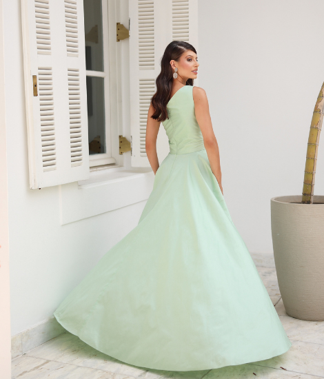 Modelo corte A, na sofisticada cor verde menta, com design de um ombro só e elegantes drapeados no busto