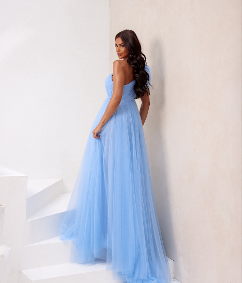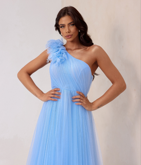 Vestido azul serenity, um ombro só, com plumas e tule, combina leveza e sofisticação para eventos elegantes.