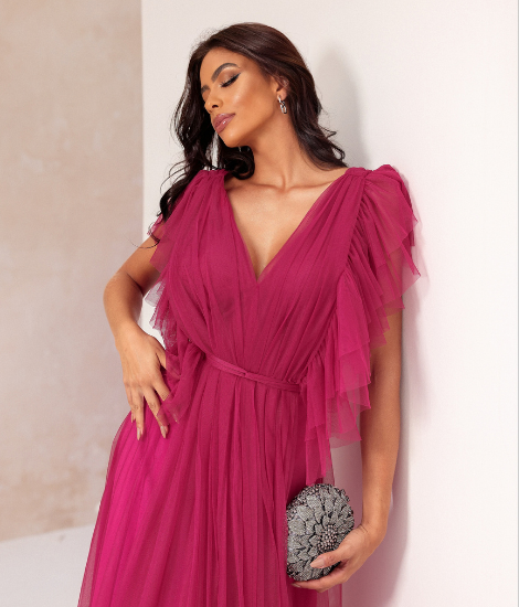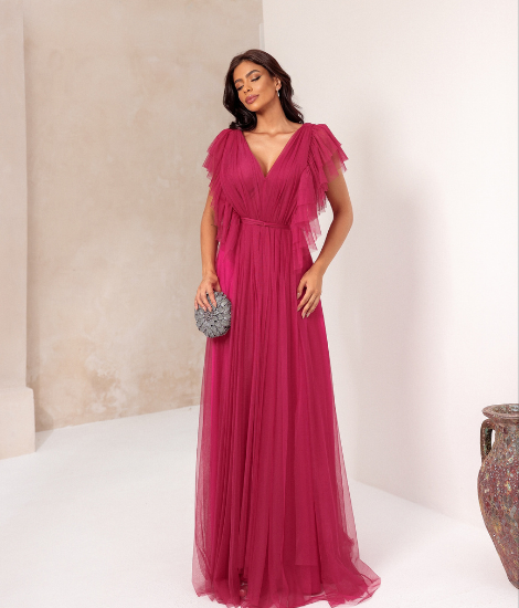 O Vestido Aurora é um modelo longo fluido na cor fúcsia, com mangas de babados que trazem leveza e um toque romântico. Ideal para ocasiões especiais que pedem elegância e sofisticação.