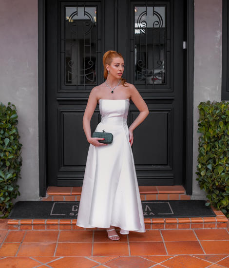 Vestido alfaiataria branco tomara que caia, com corte impecável e sofisticação atemporal.