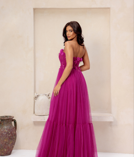 Vestido tomara que caia em fúcsia/rosa pink, com busto semi-bordado de rosas em 3D e saia fluida em tule. Elegante e romântico para ocasiões especiais.