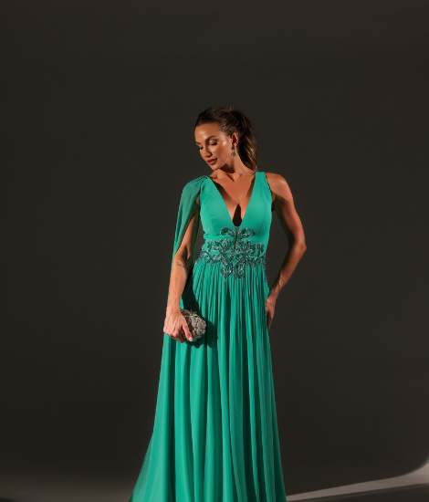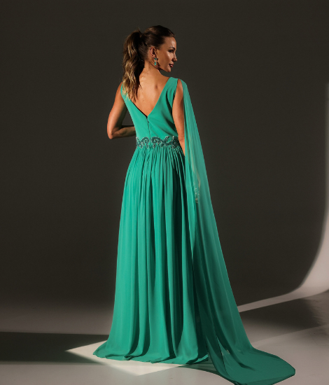 Vestido verde tiffany fluido com corte evasê, capa assimétrica em um ombro e bordados delicados em cristais verde escuro na cintura. Elegante e sofisticado.