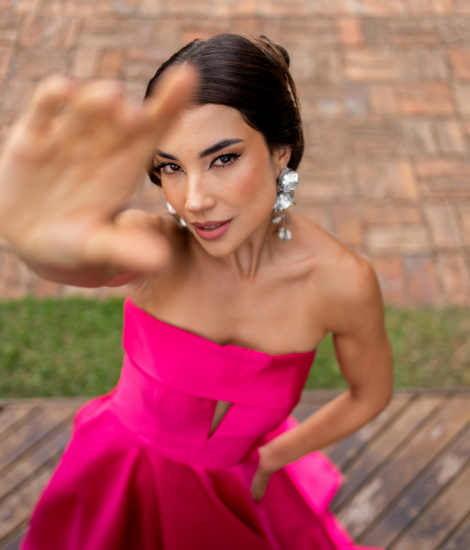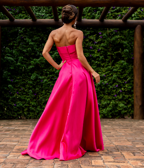 Vestido longo em alfaiataria zibeline na cor pink/rosa chiclete. Modelo tomara que caia com recorte no busto e saia estruturada em evasê. Um look moderno e vibrante, ideal para madrinhas ousadas e convidadas estilosas.