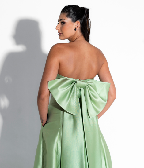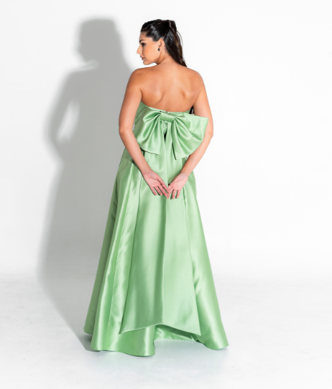 Vestido verde claro em tecido zibeline com modelagem tomara que caia e detalhe de recorte na cintura. A parte de trás é finalizada com um laço estruturado em grande proporção, conferindo um toque marcante à peça. A saia longa tem caimento evasê e acabamento liso.