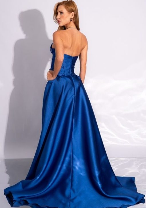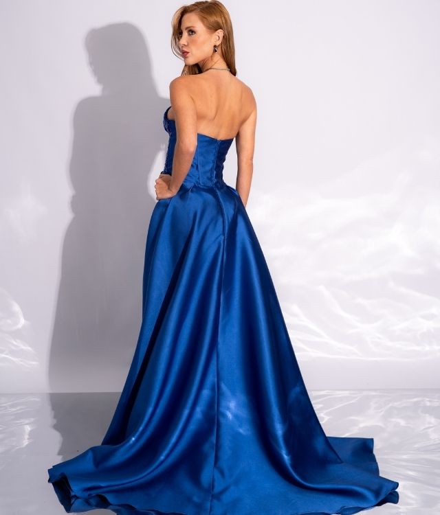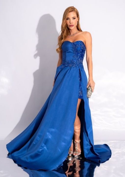 Vestido azul royal tomara que caia, busto bordado em renda e pedrarias, sobreposição de saia longa com fenda revelando minissaia interna.