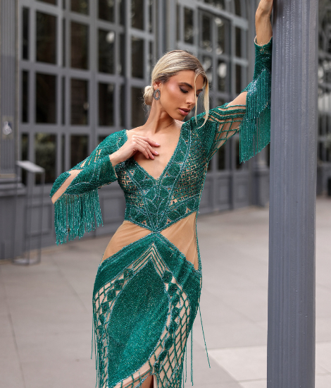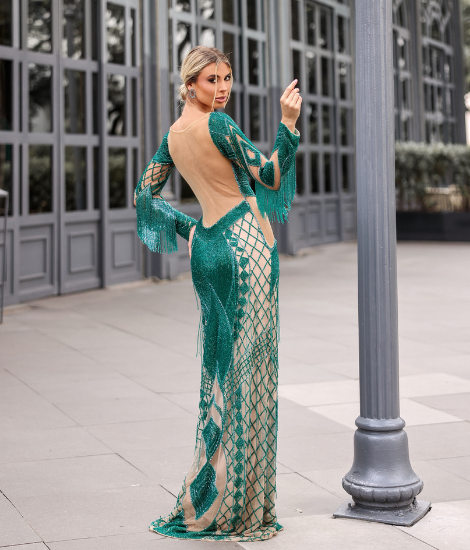 Vestido Sthefany. Vestido longo verde deslumbrante, inteiramente bordado. O modelo destaca-se pelo decote V, fenda elegante, mangas longas, transparências estratégicas e detalhes em franjas.