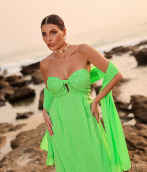 Modelo tomara que caia em tom verde claro, com detalhes discretos que trazem elegância. Acompanha uma fluida e leve pashmina, perfeita para complementar o look em eventos ao ar livre.