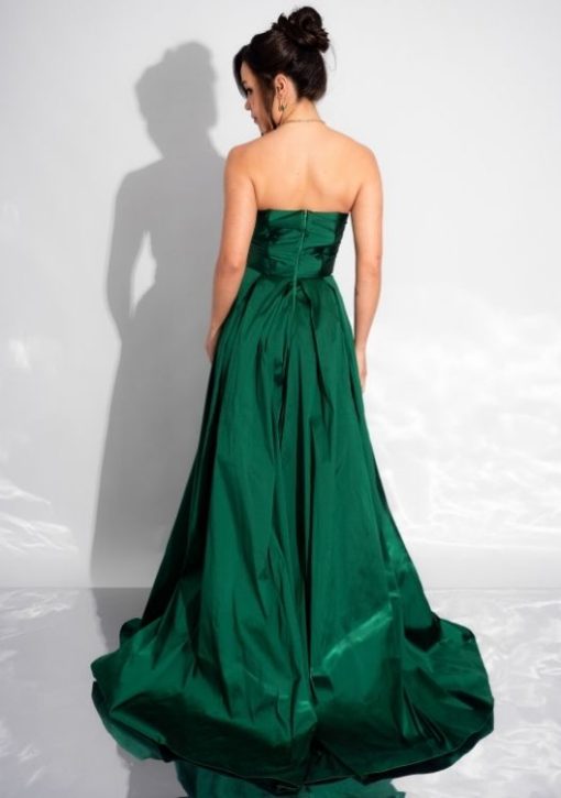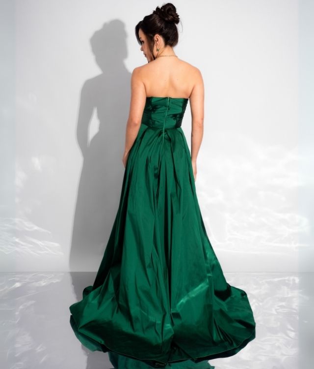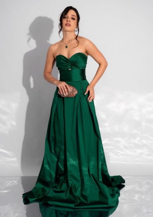 Vestido longo verde bandeira, tomara que caia com decote coração, detalhe vazado no busto, cintura marcada e saia ampla em tecido acetinado.